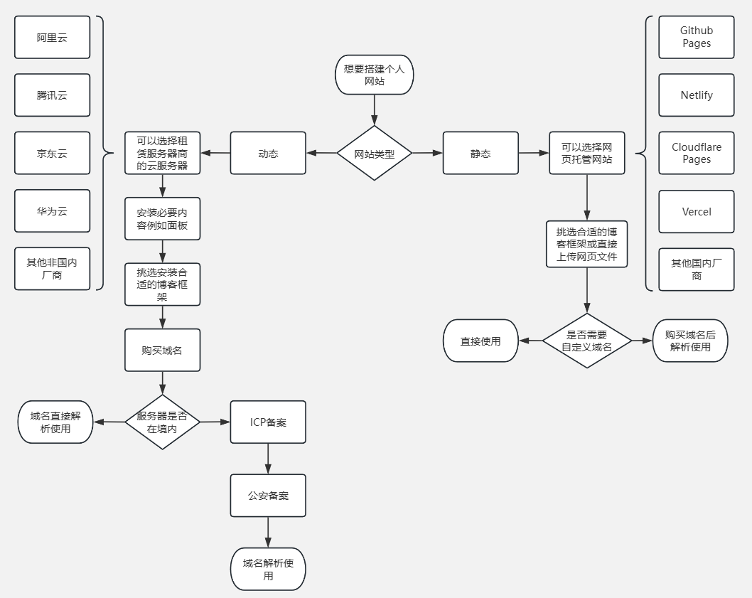 - 想搭建静态网站也可以使用自购服务器的方式来搭建,想要能够托管动态网页的也有办法,这图只不过是介绍一下常用的流程。