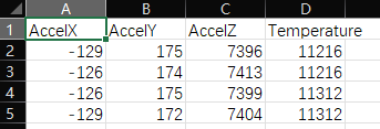 与加速度伴随的温度数据来自加速度传感器内部,器件发热,因此计算出温度高于室温;02 BD的有效原始数据计算后得出温度为39.8°C.