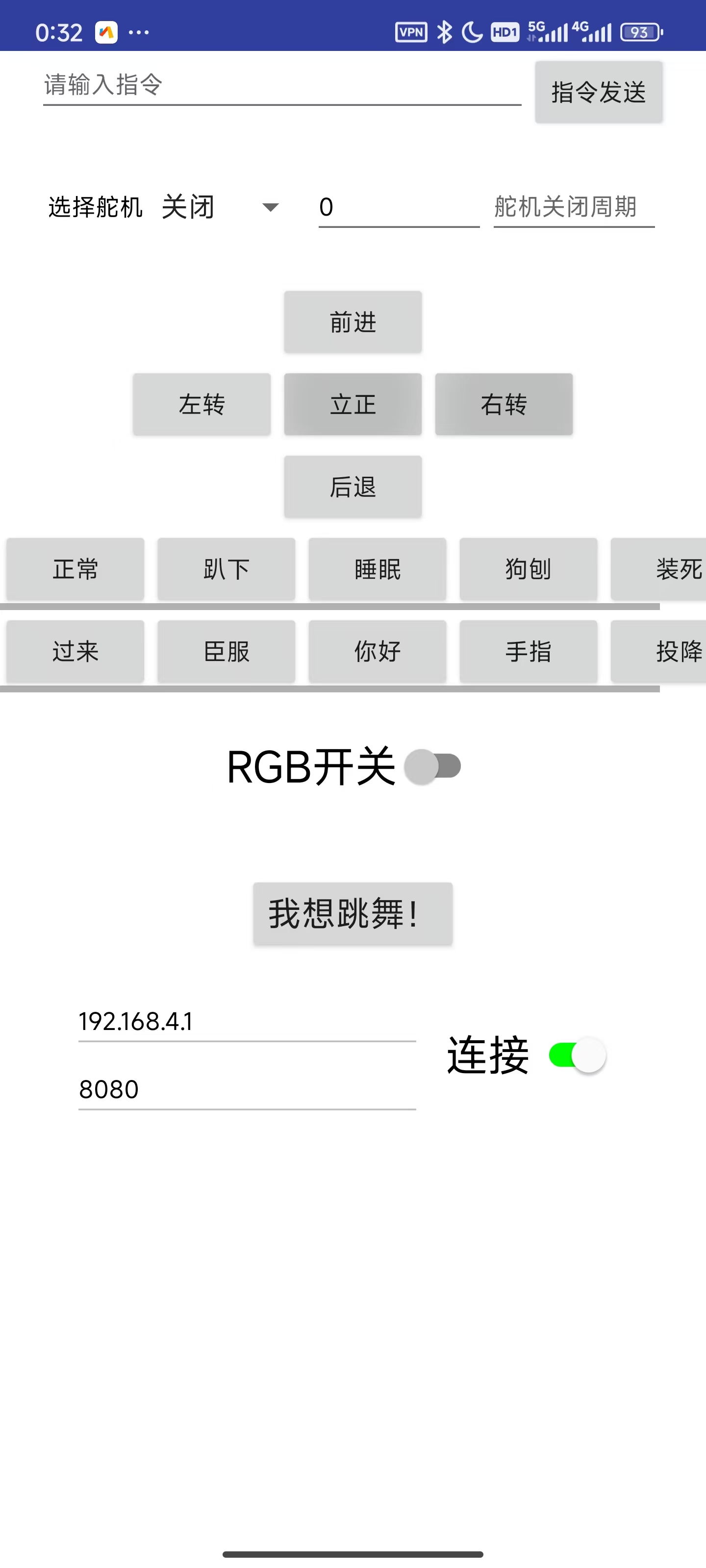 - 功能指令包括:动作控制,单个舵机控制,PWM频率控制,配网,配置OTA更新网址,切换ESP32的WiFi模式,触发OTA更新程序。