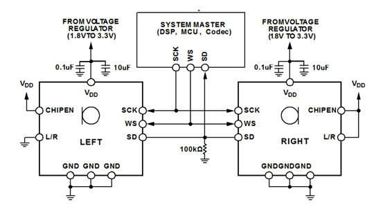 通过I2S通信与主控连接,作为从机接收来自主控的时钟线,并通过数据线将数据发送给主控。