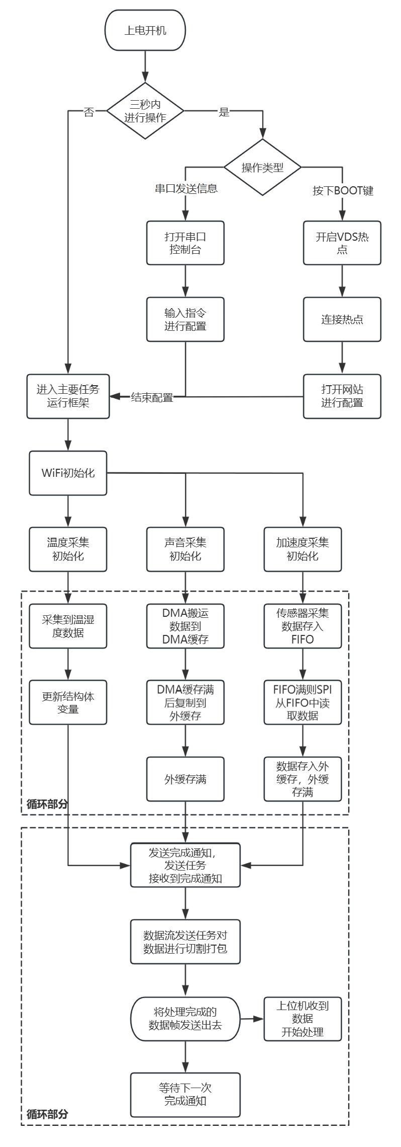 系统采用上下位机通信架构,电机监测器 VDS 上包括了主控ESP32、硅麦克风、加速度传感器、电源模块、按钮、电源开关、天线,复制数据的采集、预处理及发送。